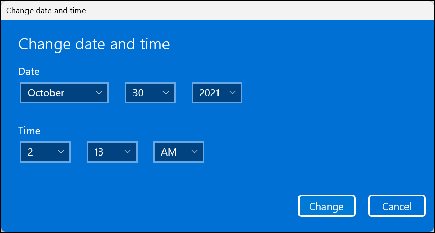 4. W wyskakującym oknie Zmień datę i godzinę ustaw datę na 30 października 2021 r. (lub wcześniejszą), a godzinę pozostaw bez zmian. Następnie kliknij „Zmiana“.