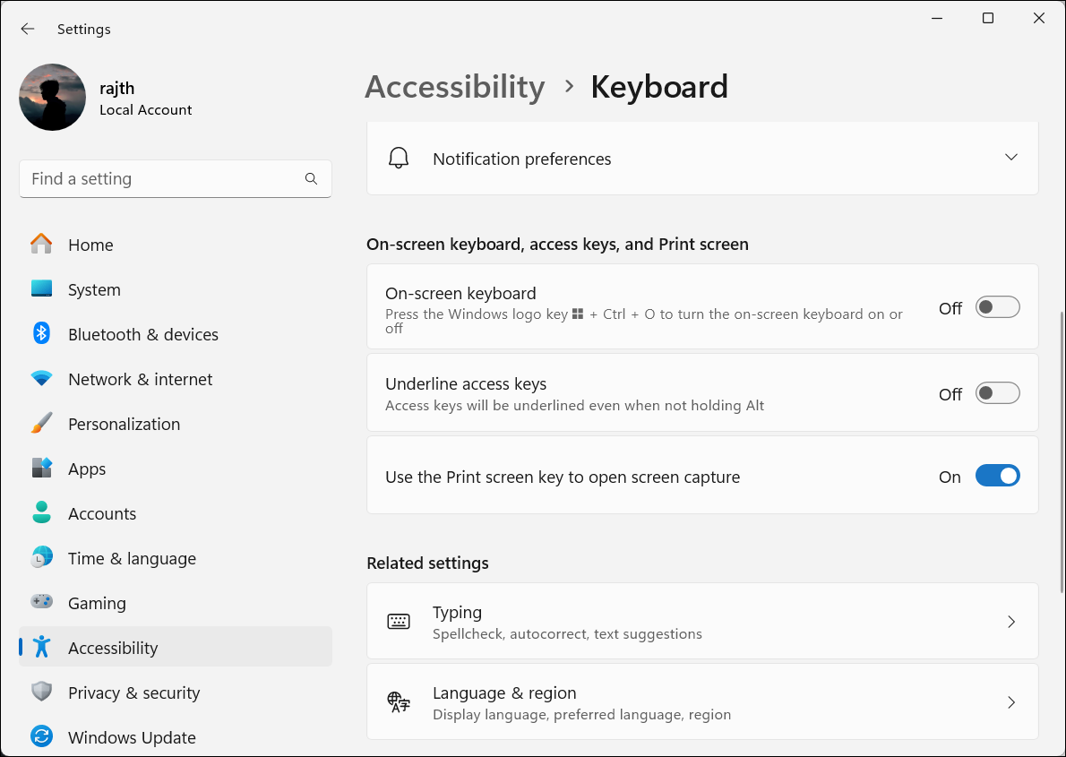 4. Otworzą się ustawienia systemu Windows. Tutaj znajdź i włącz opcję „Użyj klawisza Print Screen, aby otworzyć zrzut ekranuopcja.
