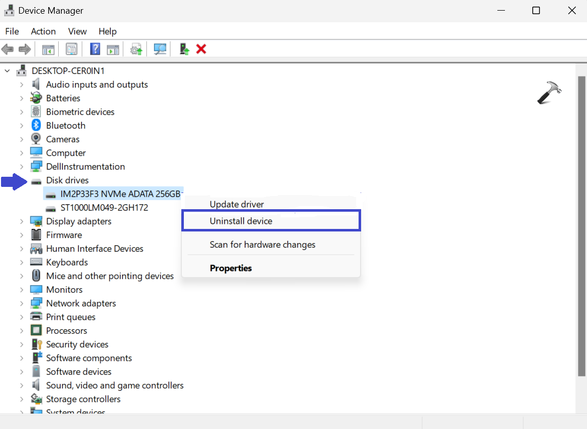 3. Kliknij prawym przyciskiem myszy dysk SSD i wybierz „Odinstaluj urządzenie”.
