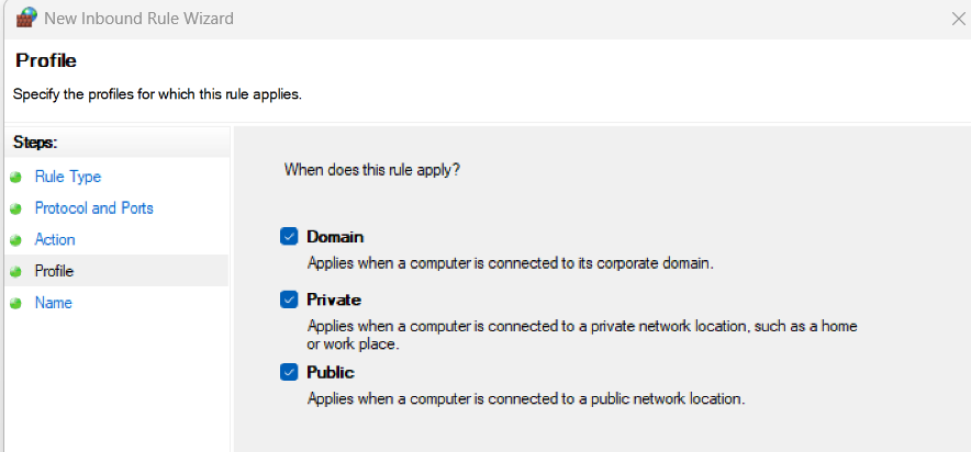 10.WybierzDalej >przycisk, a następnie sprawdźDomena, prywatna i publicznaopcje, aby kontynuować.