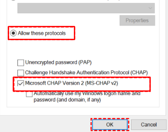 - Wyłączono protokół Microsoft Chap w wersji 2