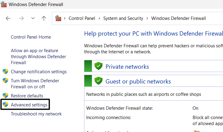 5.WPanel sterowania, przejdź do podanej poniżej ścieżki lub przejdź doZapora systemu Windows Defender:
