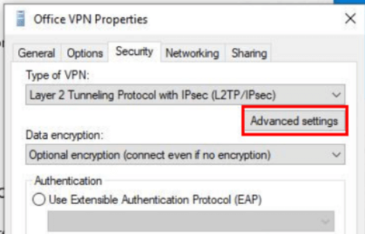 5.wBezpieczeństwokartę, po prostu wybierzUstawienia zaawansowaneprzycisk wTyp VPN:sekcja.