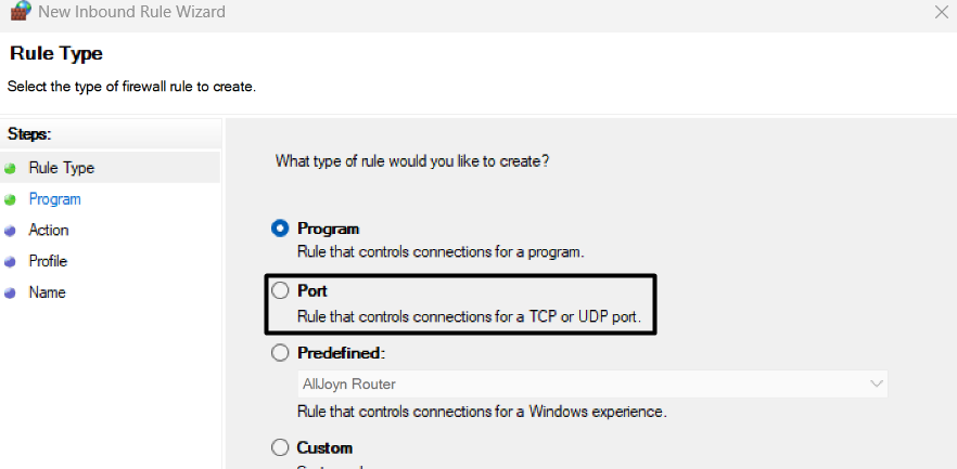 8.W nowym oknie sprawdźPortprzycisk opcji, a następnie kliknij przyciskDalej >opcję, aby iść dalej.