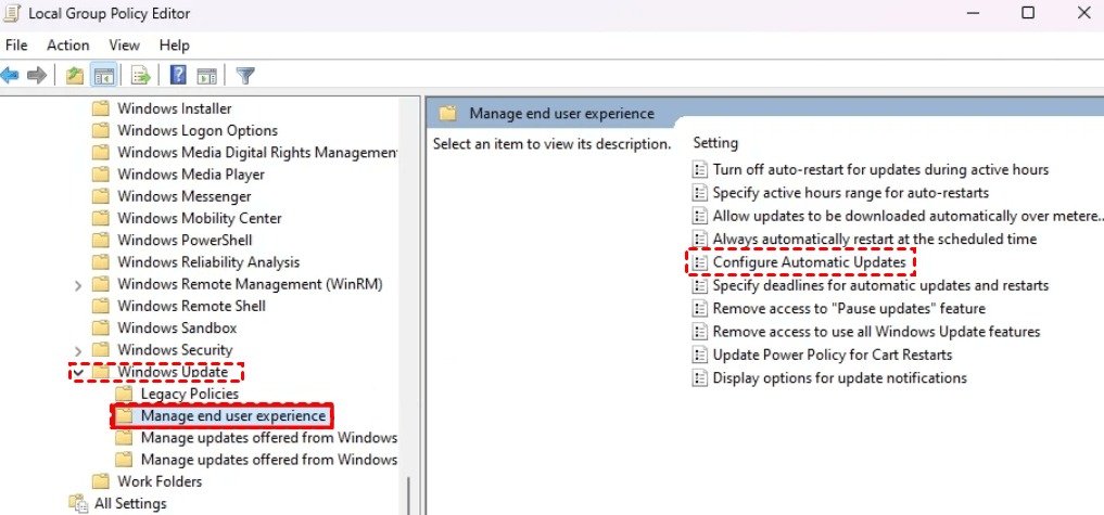 Computer Configuration > Administrative Templates > Windows Components > Windows Update > Manage End User Experience3.Po zakończeniu kliknij dwukrotnie plikSkonfiguruj aktualizacje automatyczneopcję w prawym okienku, aby ją otworzyć.