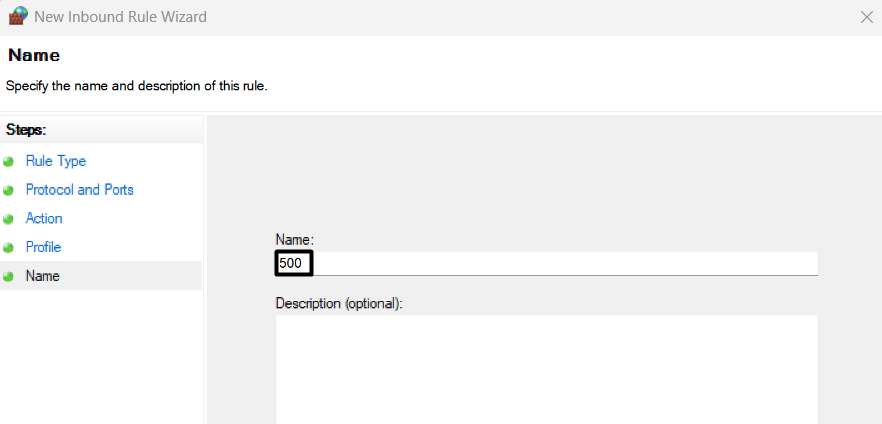 11.Kliknij naDalej >przycisk, nazwij go500, a następnie kliknij przyciskSkończyćprzycisk, aby zapisać zmiany. Na koniec wykonaj te same kroki, aby utworzyć4500Port UDP dostępny w Twoim systemie.