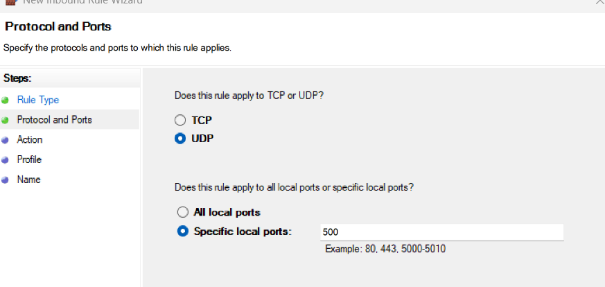9.WybieraćUDP, typ500wKonkretne porty lokalne:pole tekstowe, a następnie zaznaczZezwól na połączenie.