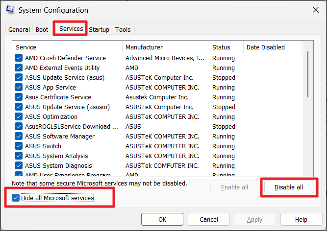 2. Przejdź do „Usługi”zakładkę, zaznacz „Ukryj wszystkie usługi Microsoft„ i kliknij „Wyłącz wszystko“.