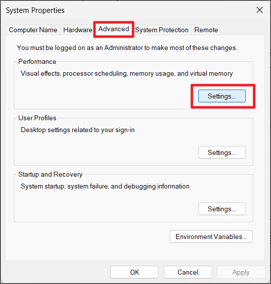 3. WZaawansowanykliknij przycisk „Ustawienia” w sekcji Wydajność.