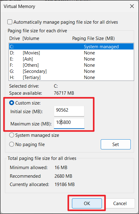 6. Następnie wybierz „Rozmiar niestandardowy” i określRozmiar początkowy (MB)IMaksymalny rozmiar (MB)dla Twojej pamięci wirtualnej.