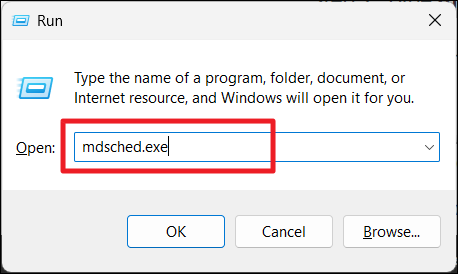 1. NaciśnijWygrać+R, aby otworzyć okno Uruchom. Typmdsched.exei uderzyłWchodzićaby uruchomić Diagnostykę pamięci systemu Windows.