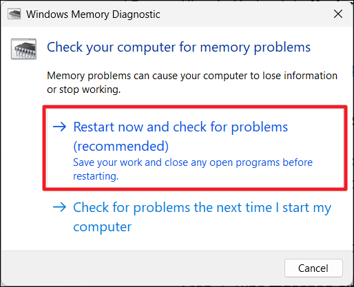 2. Kliknij „Uruchom ponownie teraz i sprawdź, czy nie występują problemy (zalecane)”, aby rozpocząć proces.