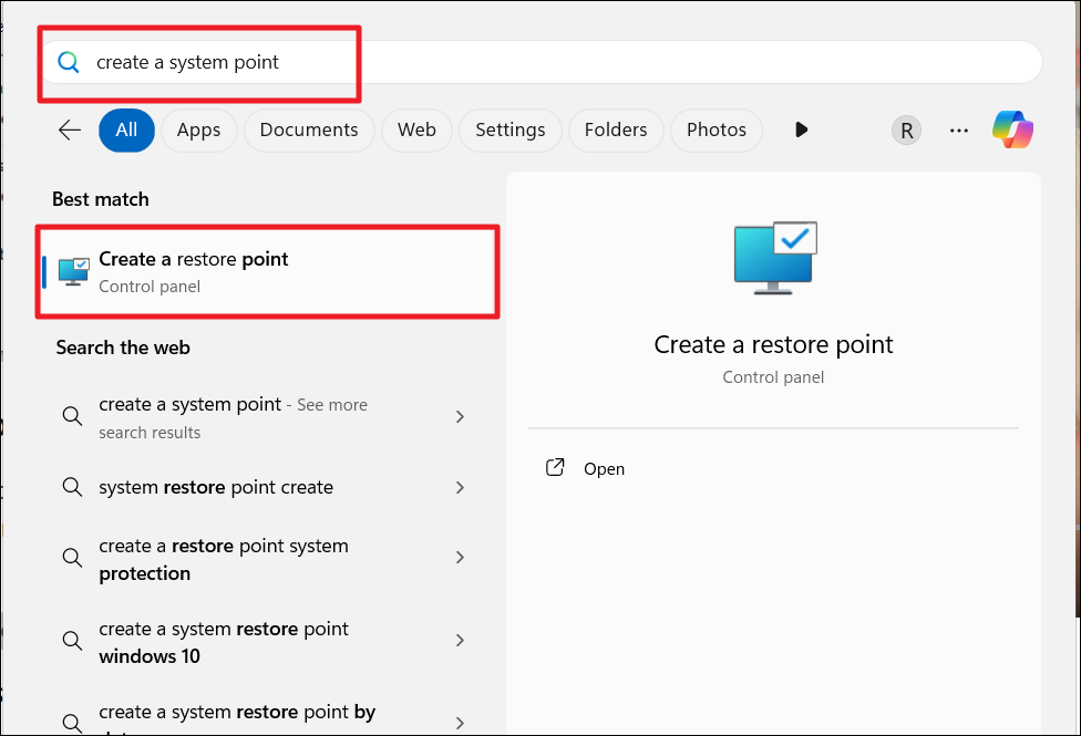 1. Wyszukaj „utwórz punkt przywracania” i naciśnij Enter.