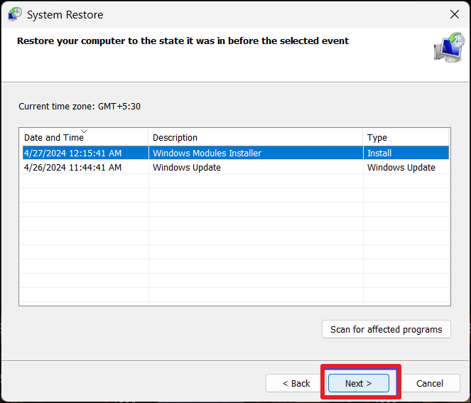 3. Wybierz punkt przywracania i kliknij „Następny“.