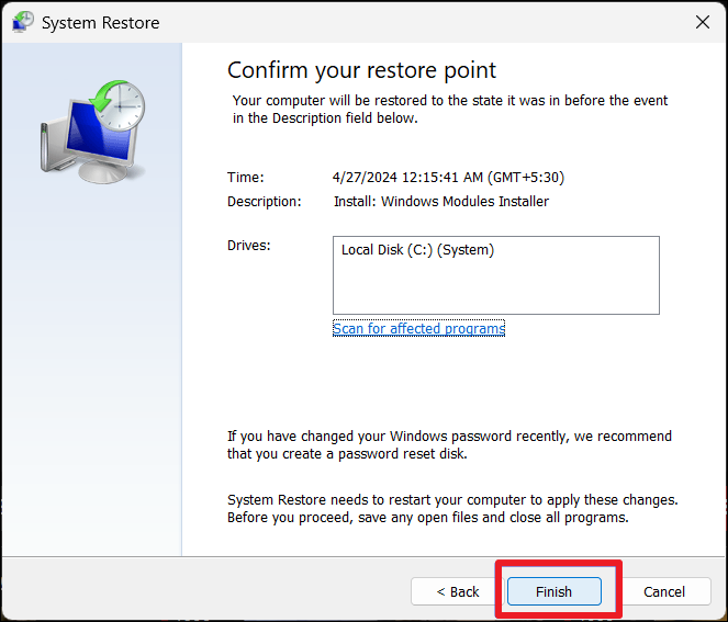 4. Po potwierdzeniu punktu przywracania kliknij „Skończyć“.