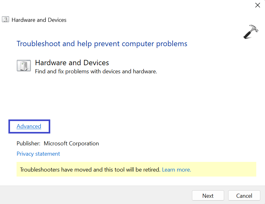 Rozwiązanie 4: Uruchom narzędzie do rozwiązywania problemów ze sprzętem
