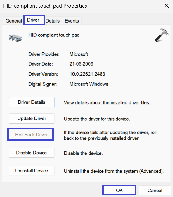 Jeśli po aktualizacji sterownika zaobserwowałeś zniknięcie ustawień touchpada w systemie Windows 11, rozważ przywrócenie poprzedniej wersji sterownika touchpada.