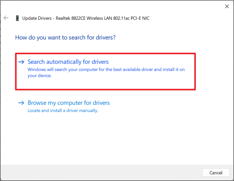 4. Wybierz „Wyszukaj automatycznie sterowniki„. Jeśli to nie zadziała, pobierz najnowszy sterownik Wi-Fi ze strony producenta i zainstaluj go.