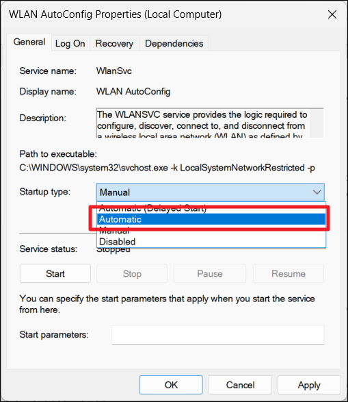 3. Wybierz „Automatyczny"zTyp uruchomieniamenu rozwijane.