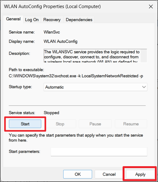 4. Kliknij „Start” jeśli usługa nie jest uruchomiona, kliknij „Stosować" I "OK“.