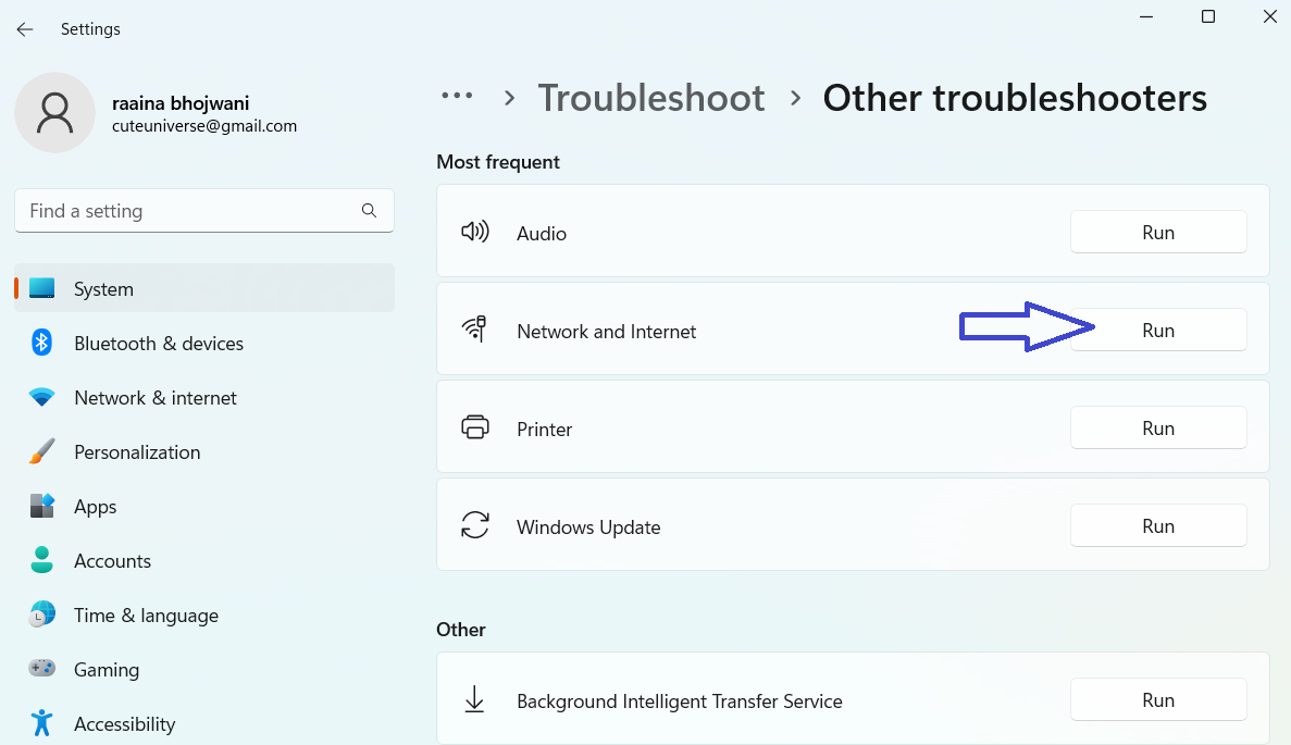 4. Kliknij „Uruchom” w obszarze Sieć i Internet.