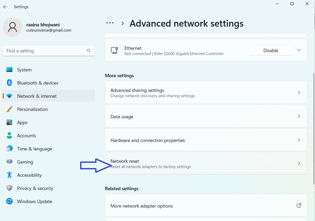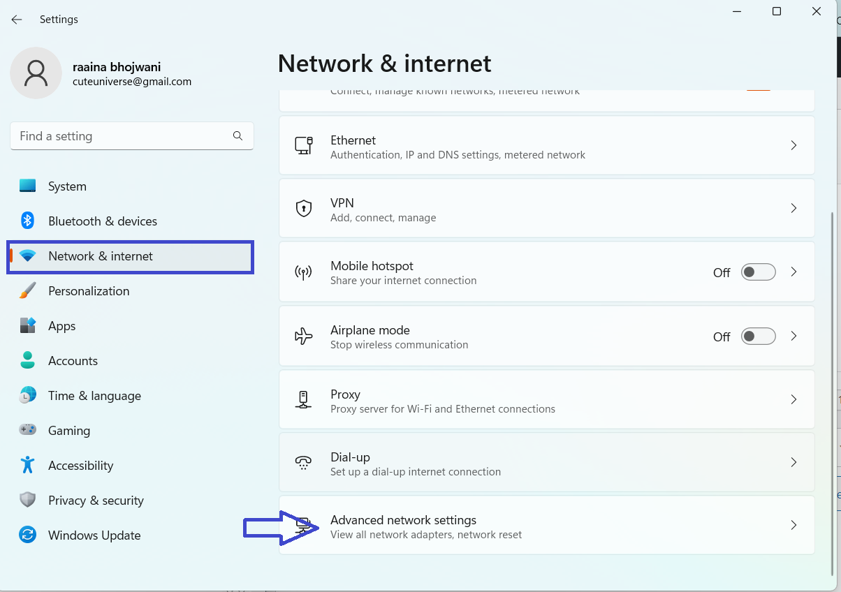 2. Kliknij „Sieć i Internet” > kliknij „Zaawansowane ustawienia sieci”.