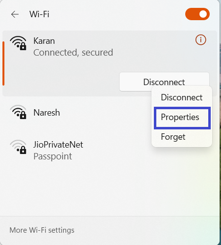 3. Kliknij prawym przyciskiem myszy nazwę Wi-Fi zwykle podłączonej do Twojego systemu i wybierz „Właściwości”.
