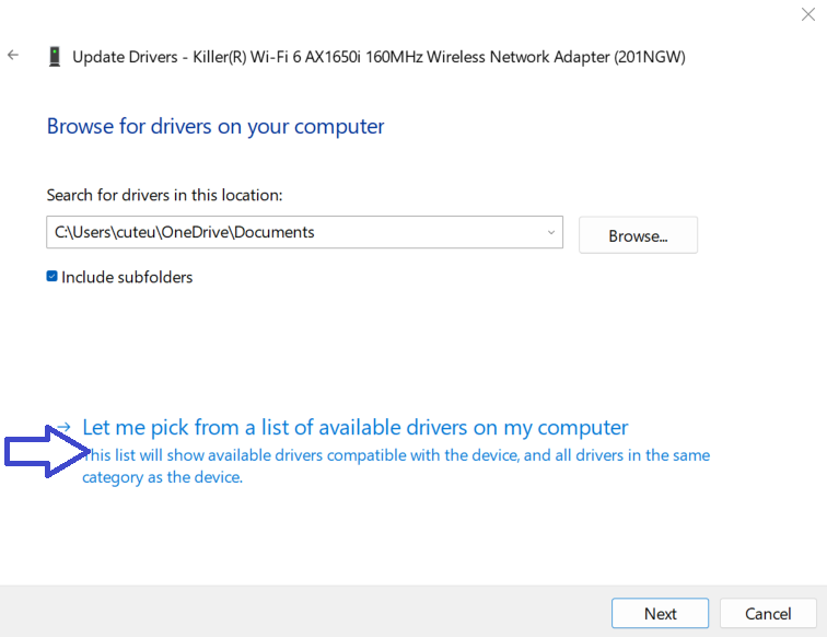 4. Kliknij „Pozwól mi wybrać z listy dostępnych sterowników na moim komputerze”.