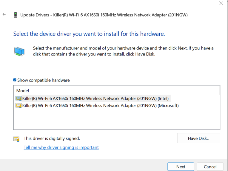 5. Kliknij sterownik odpowiedni dla Twojej karty WiFi i kliknij „Dalej”.