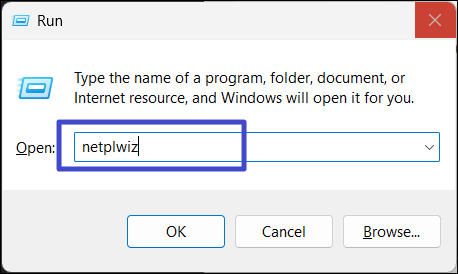 1. Otwórz okno poleceń Uruchom, naciskając Win + R. Następnie wpisz „netplwiz”i naciśnij Enter.