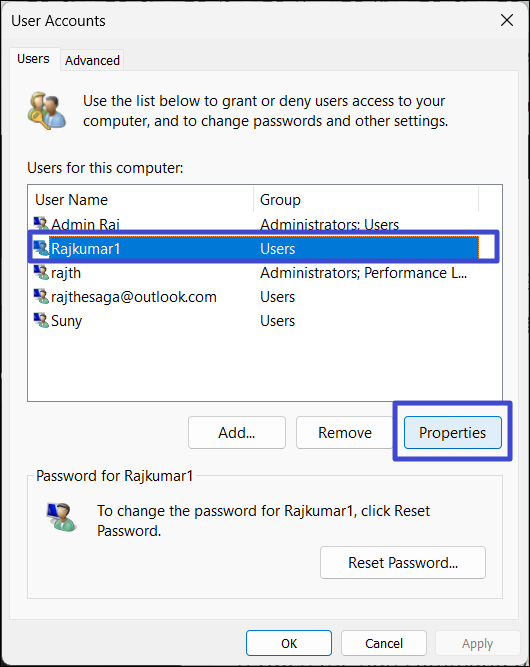 3. Wybierz konto użytkownika, na którym występuje błąd „Odmowa dostępu” i kliknij przycisk „Właściwości" przycisk.