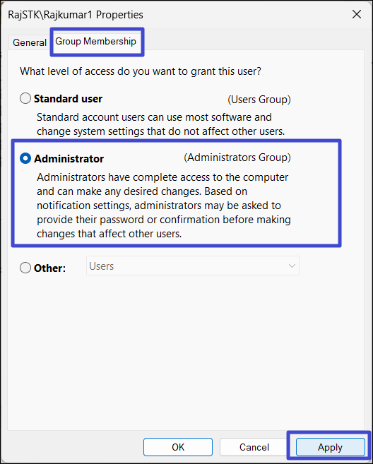4. W folderze Konta użytkowników przejdź do „Członkostwo w Grupie” i wybierz „Administrator“.