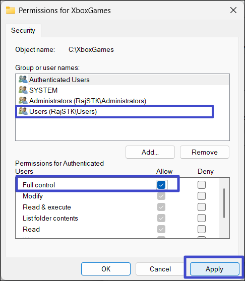 3. Wybierz konto użytkownika i zaznacz „Pełna kontrola”pudełko wUmożliwićkolumna podUprawnienia dla użytkownikasekcja.