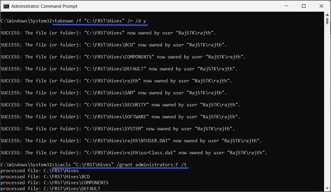 takeown /f "C:FRSTHives" /r /d y