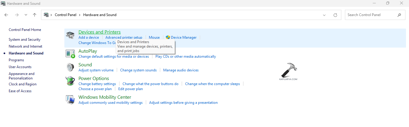 Krok 2-Następnie wybierz Sprzęt i dźwięk > Urządzenia i drukarki.