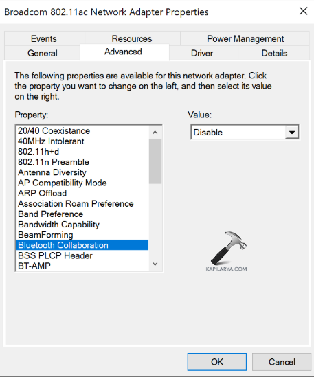 Krok 3-Wybierz kartę Zaawansowane i wybierz opcję Współpraca Bluetooth z pola właściwości.