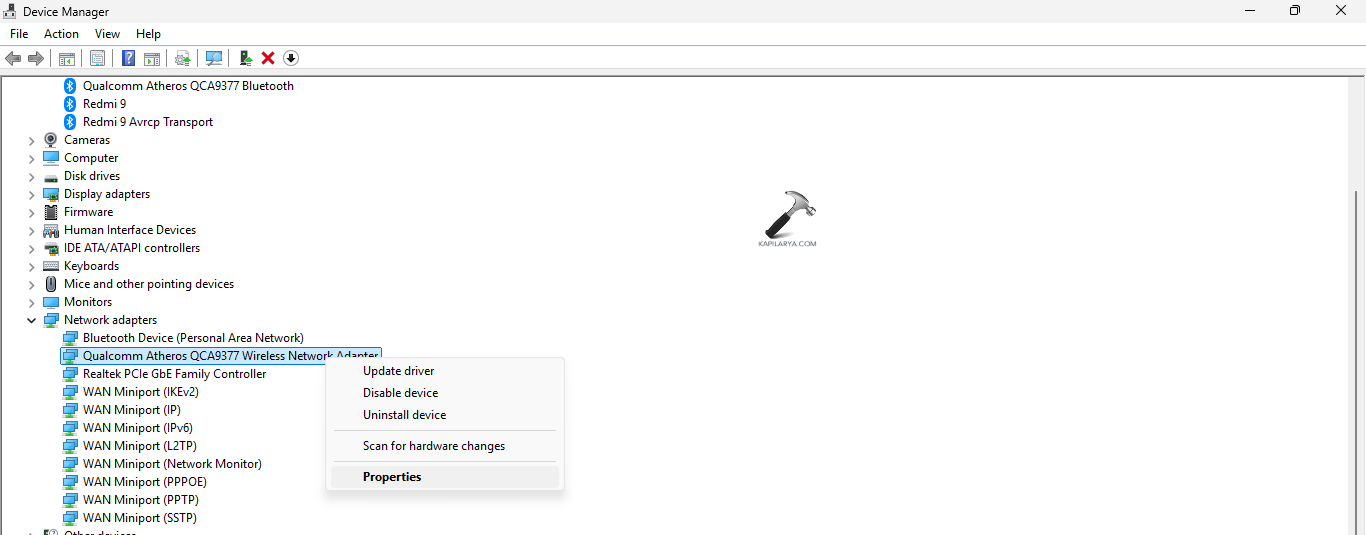 Krok 2-Kliknij prawym przyciskiem myszy sterownik karty Wi-Fi i naciśnij Właściwości.