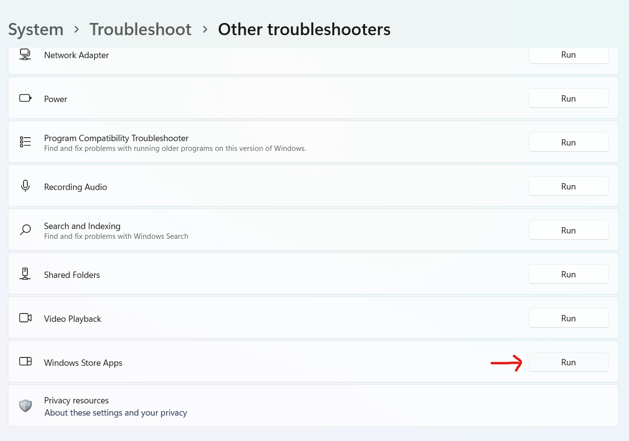 3 – Na wyświetlonej liście narzędzi do rozwiązywania problemów z systemem Windows 11 znajdźAplikacje ze Sklepu Windows,i kliknijUruchomić