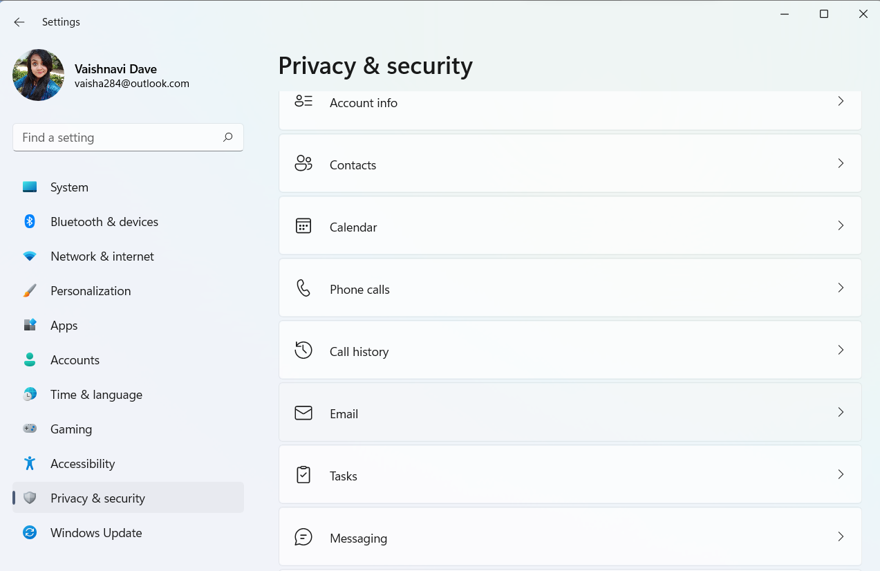 1 – Idź doPrywatność i bezpieczeństwosekcja w systemie Windows 11Aplikacja Ustawienia. WybieraćE-mail.