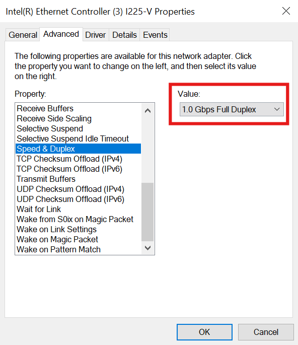4. Ustaw wartość na „1,0 Gbps Full Duplex” (lub wartość maksymalną obsługiwaną przez kartę/router).