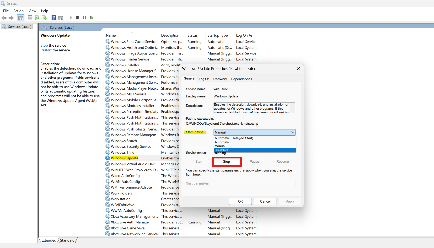 2. Przewiń w dół do Windows Update, kliknij ją dwukrotnie i kliknij Stop w oknie Właściwości.