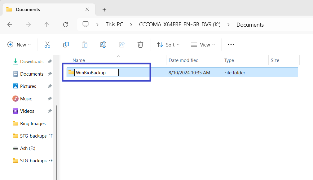 1. Otwórz Eksplorator plików i utwórz nowy folder o nazwie „WinBioBackup” w dowolnym miejscu na dysku lokalnym.