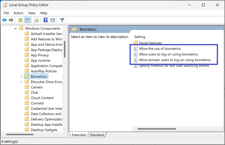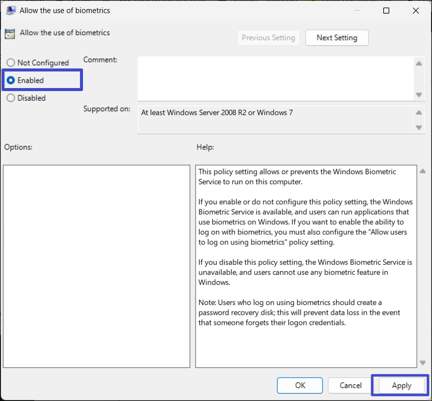 Jeśli ponowne uruchomienie usługi Biometria nie rozwiąże problemu, możesz sprawdzić, czy funkcja Biometria jest włączona w Edytorze zasad grupy.