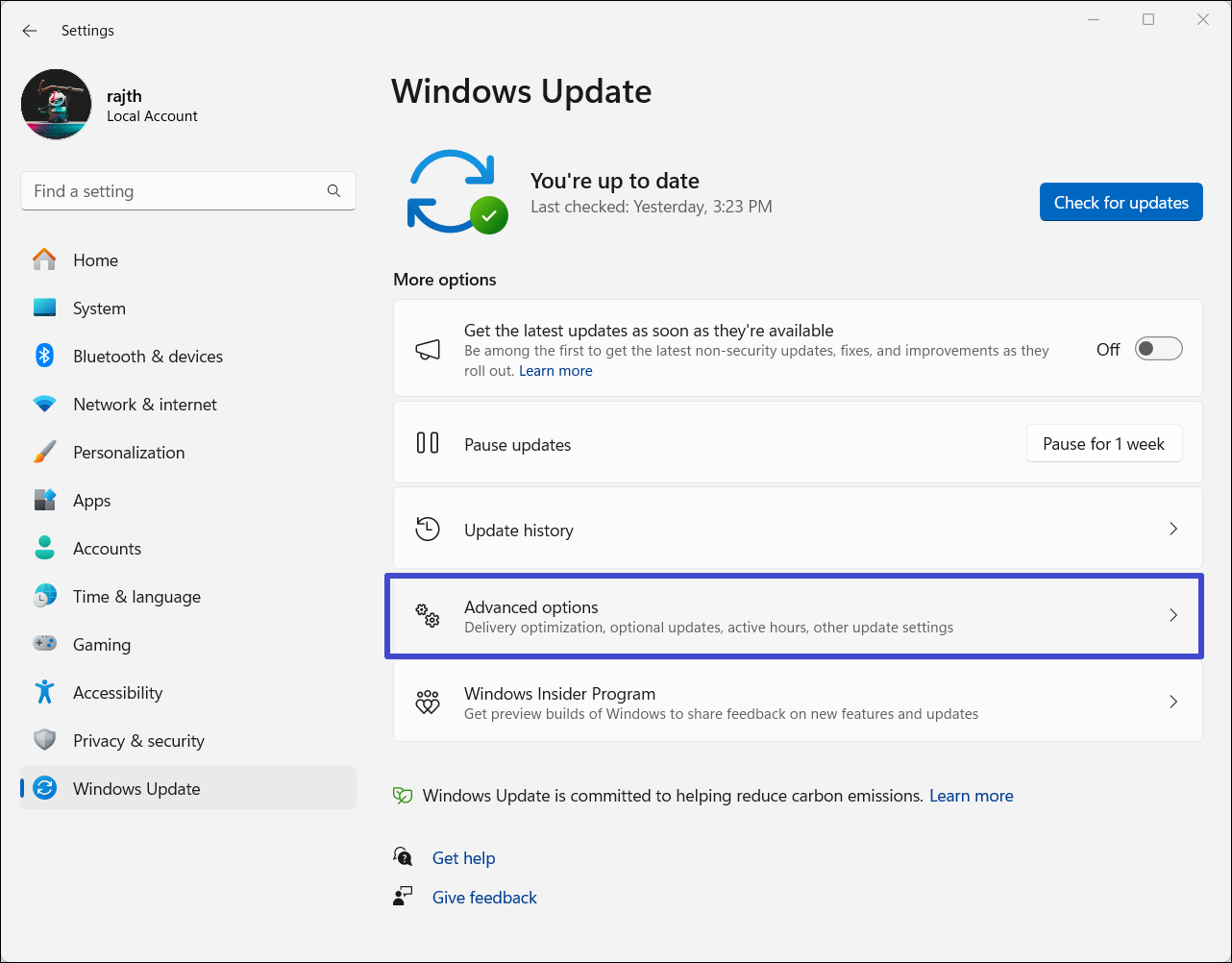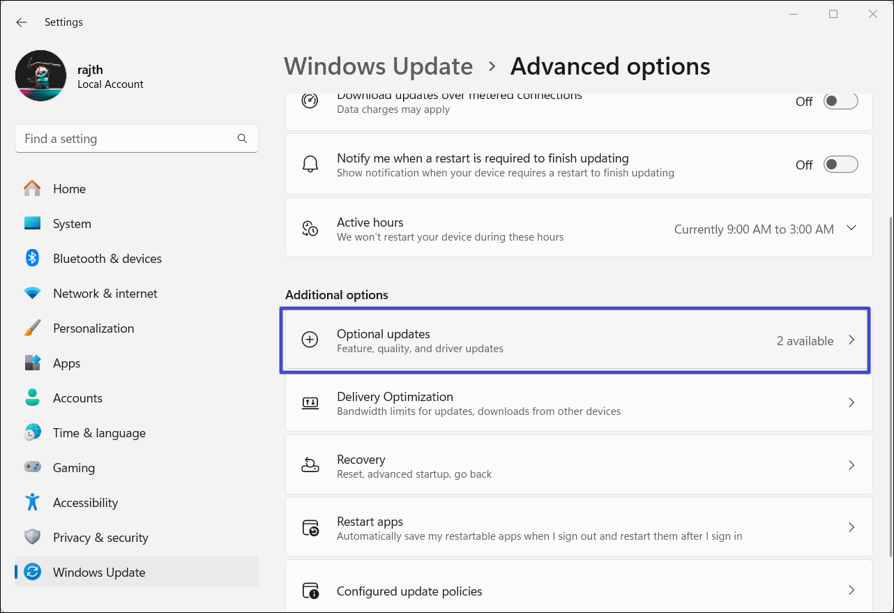 3. PodDodatkowe opcjemenu kliknij „Opcjonalne aktualizacje”.