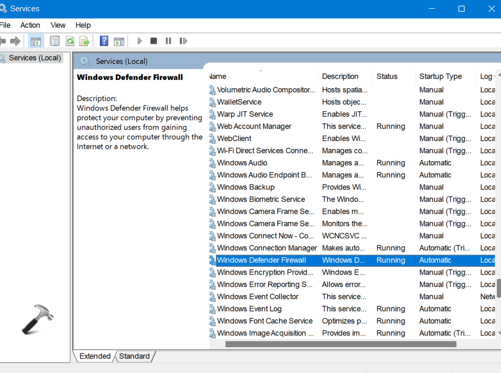 2.Teraz poszukajZapora systemu Windows Defenderi sprawdź, czy jego status toDziałanie.