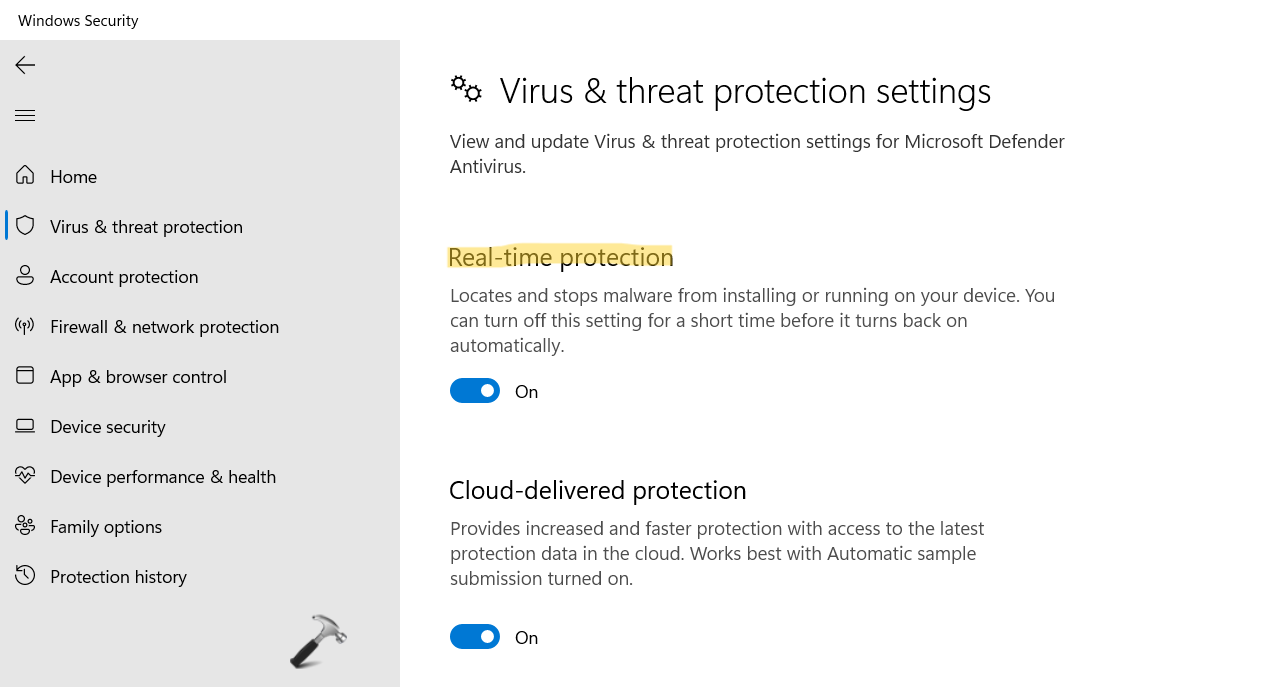 7.Również wUstawienia ochrony przed wirusami i zagrożeniami, włączOchrona w czasie rzeczywistymobracając jego przełącznikNA.