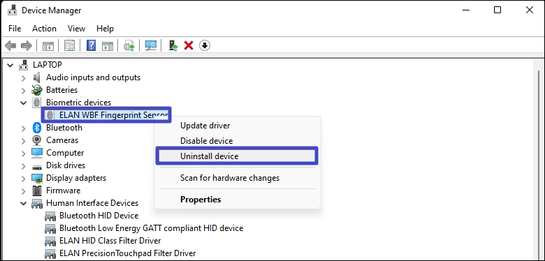 Metoda 4: Odinstaluj sterowniki urządzeń biometrycznych