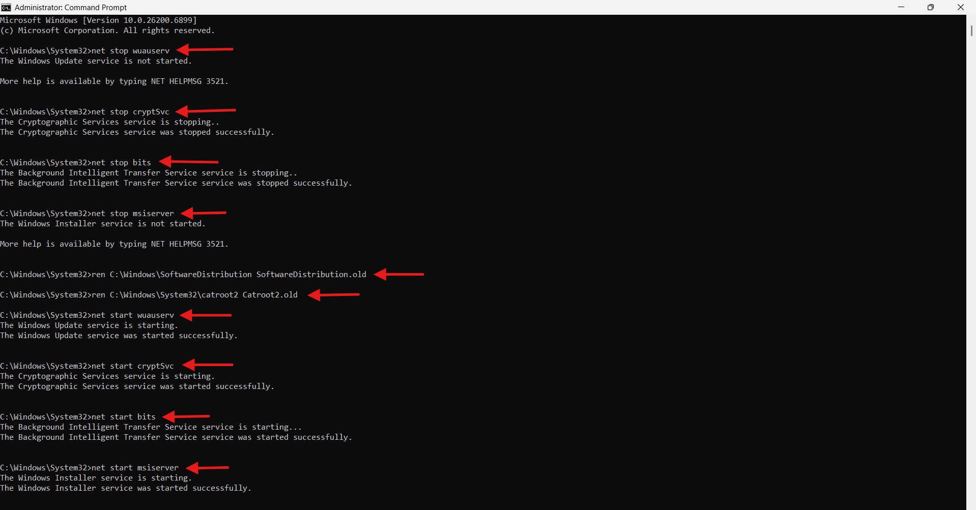 Ten proces zatrzymuje usługi aktualizacji, zmienia nazwy folderów pamięci podręcznej i uruchamia wszystko ponownie, usuwając uszkodzone dane, które często powodują błąd 0x800f0900.