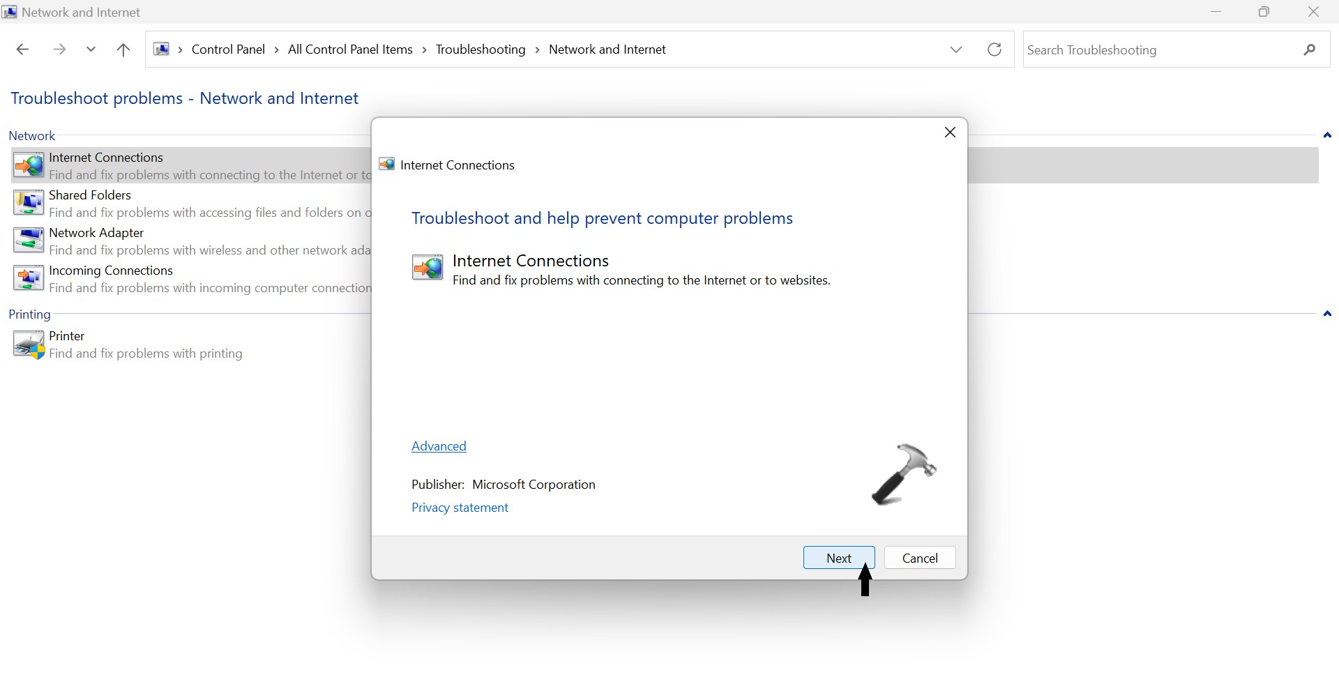 5. Na koniec wybierzRozwiązywanie problemów z połączeniem internetowymi zakończ proces.