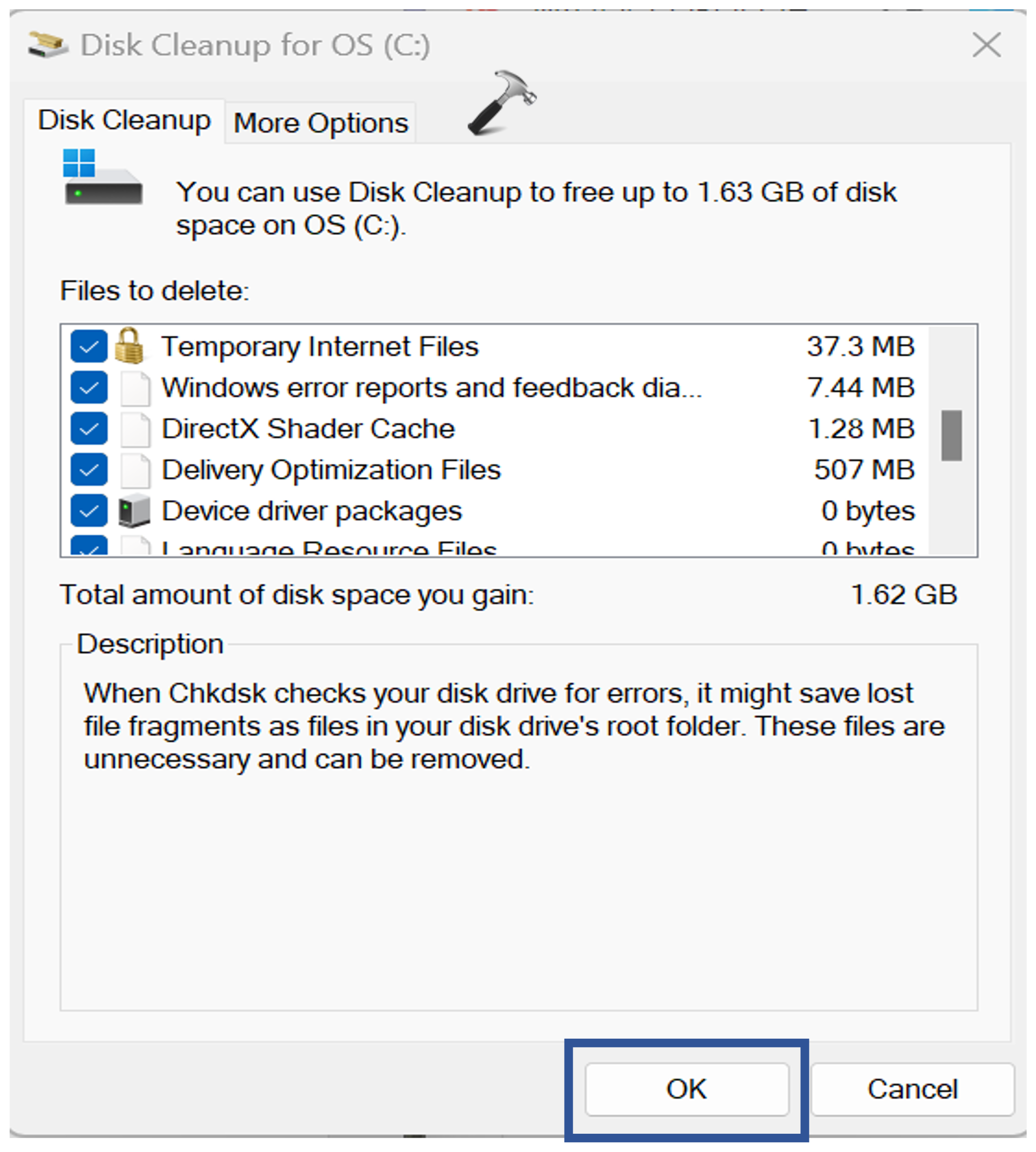2. „Oczyszczanie dyskuPojawi się wyskakujące okienko. Kliknij OK.